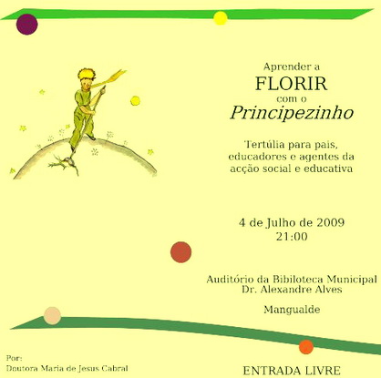 A Associação FLORIR, de Mangualde, vai dinamizar no próximo dia 4 de Julho, no âmbito da comemoração do seu primeiro aniversário, a Tertúlia para pais, educadores e agentes da acção social e educativa, “Aprender a FLORIR com o Principezinho”, pela Doutora Maria de Jesus Cabral.