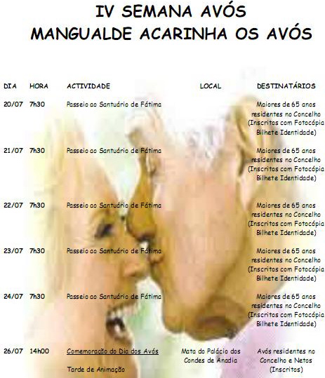 Dinamizada pela Câmara Municipal de Mangualde, irá decorrer, entre os dias 20 e 26 de Julho, a IV Semana dos Avós, cujas inscrições deverão ser efectuadas até ao próximo dia 8.